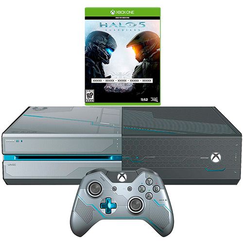 Conteúdo da Embalagem - Console XBOX One, Fonte de alimentação universal (Bivolt), Cabo HDMI, Manual de Instruções, Controle sem fio Xbox One, Fone de ouvido Xbox One para bate-papo , HDD 1TB, HALO 5 (jogo em Voucher, necessário download via internet), Capa Metálica personalizada com o tema dos Spartans contendo o Voucher para download do jogo Halo 5: Guardians; A exclusiva DLC Warzone REQ Bundle , a armadura Fotus-Class Armor e Emblema para modo Multiplayer; Uma figura do Guardian produzida por Metal Earth; A série animada Halo: The Fall of Reach, Ordens Confidenciais do Spartan Locke, Dossiê das equipes Blue e Osíris